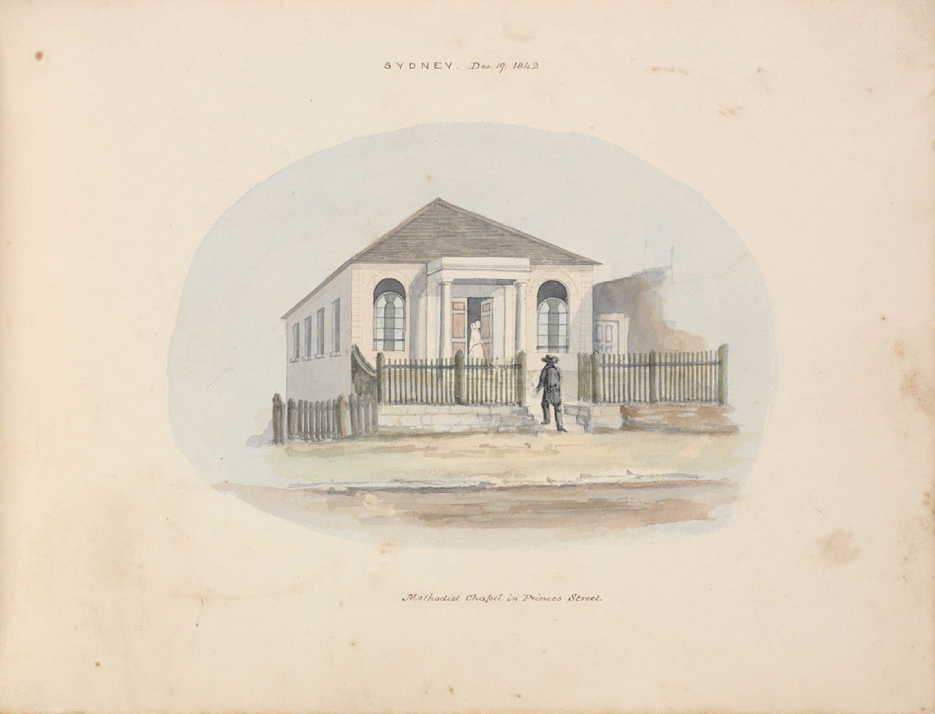 CLICK IMAGES TO ENLARGE. Left: E. T. Blacket, “SYDNEY. Dec. 19, 1842. Methodist Chapel in Princes Street,” in E. T. Blacket’s Sketch-book, (1842), PXE 925 Box 1 / FL1634535, State Library of New South Wales. Right: The photographer is unknown; the image comes from from James Colwell, The Illustrated History of Methodism. Australia: 1812–1855. New South Wales and Polynesia: 1856 to 1902, (Sydney &c: William Brooks and Co., 1904), p. 46. Courtesy of University of California Libraries via Internet Archive. The first Wesleyan chapel, pictured in a sketch and a photograph above, was located on Princes Street, Talla-wo-la-dah (The Rocks) and was opened by Reverend Samuel Leigh in March 1819. The street is no longer extant. It ran along the crown of the ridge to the west of Sydney Cove. The southern approach road between the northern end of York Street and the southern pylon of the Sydney Harbour Bridge today follows the line of Princes Street. Its imminent demolition following the State government’s resumption of The Rocks area was sadly noted by a Sydney Morning Herald journalist in January 1902.