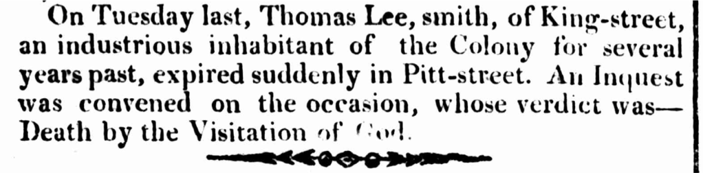 [32] “On Tuesday last, Thomas Lee, smith, of King-street,” The Sydney Gazette and New South Wales Advertiser (NSW : 1803 – 1842), Saturday 4 October 1817, p. 3.