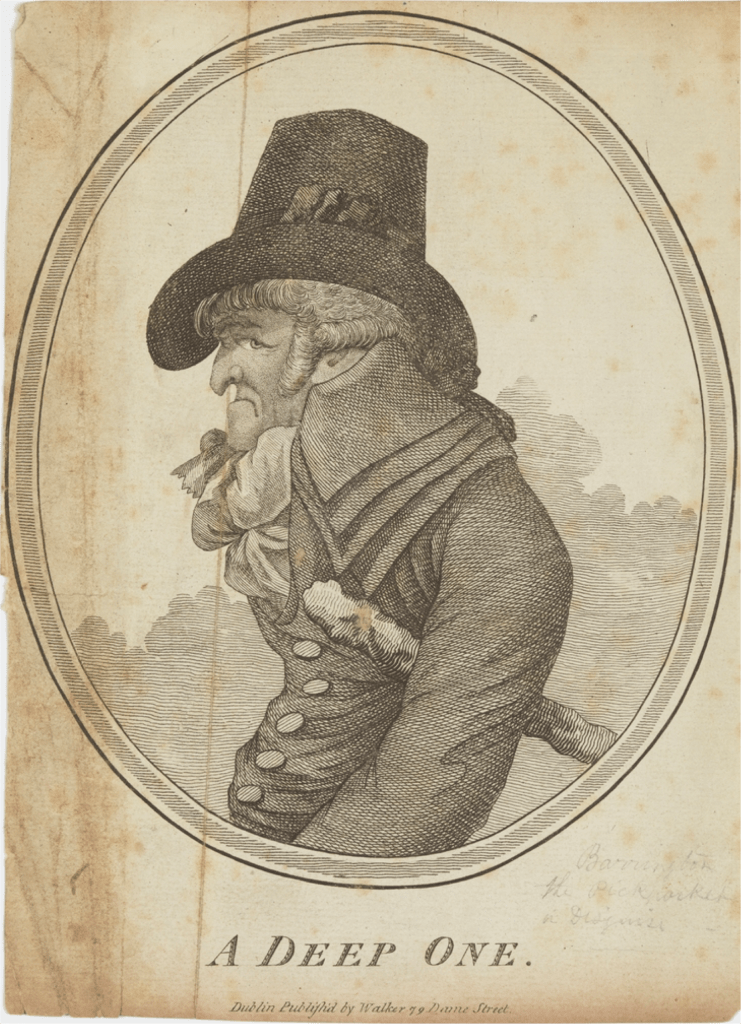 Barrington had served his apprenticeship as a pickpocket among a group of travelling players and swindlers in Éire (Ireland), where he was reportedly born ‘George Waldron’ in Maigh Nuad, Contae Chill Dara (Maynooth, County Kildare) in 1755.[11] He sailed to England in 1773 and adopted the look and feasible backstory of a young man of some fortune and breeding, (a persona entirely funded by the spoils of his crimes), which allowed the imposter to quickly and effectively ingratiate himself with English gentlefolk before picking gold watches and other trinkets from their pockets without being detected or even suspected. Two years on, however, Barrington ‘advanced with new audacity,’ distinguishing himself from the common pickpocket by attempting more difficult and more valuable acquisitions.[12] In succeeding ‘beyond the most sanguine expectations that could have been formed’ in stealing ‘the diamond order of some of the Knights of the Garter, Bath and Thistle’ and absconding ‘perfectly unsuspected,’[13] he set an impeccably high standard for himself, and this appetite for more audacious crimes also came with higher risk.