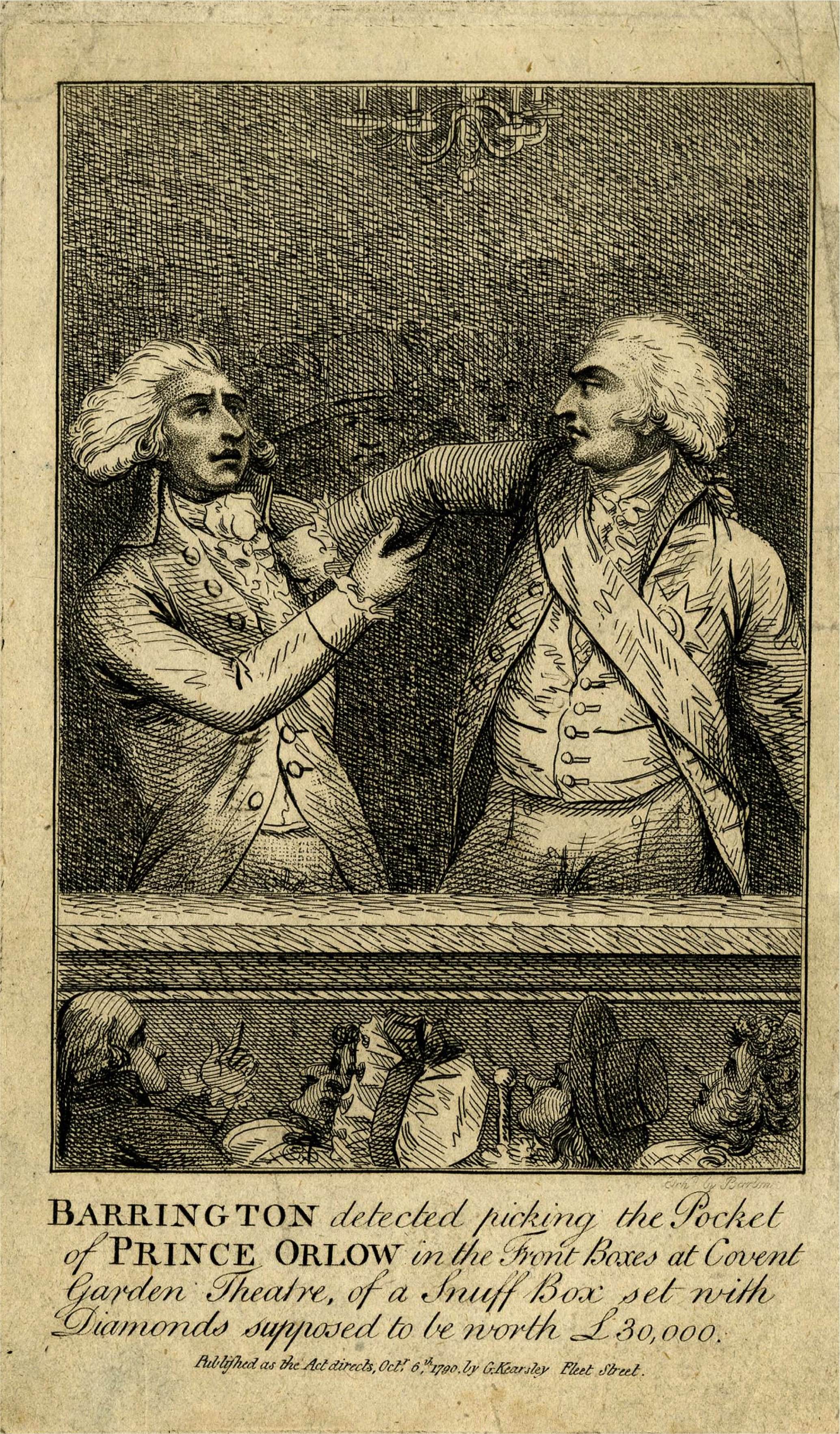 Barrington detected picking the Pocket of Prince Orlow, in the Front Boxes at the Covent Garden Theatre, of a Snuff Box set with Diamonds supposed to be worth £30,000, (Fleet Street [London]: G. Kearsley, 6 October 1790), (CC BY-NC-SA 4.0), © The Trustees of the British Museum.
