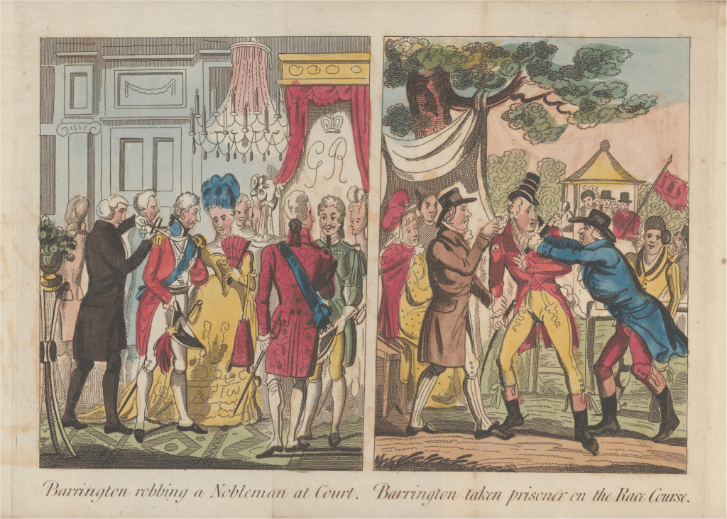 “Barrington robbing a Nobleman at Court; Barrington taken prisoner on the Race Course,” in John Fairburn & Rodney Disney Davidson, Fairburn’s Edition of the Life, Amours, and Wonderful Adventures of that Notorious Pickpocket, George Barrington, giving a full account of his trial, and conviction, with many curious anecdotes of this notorious character, (London: J. Fairburn, 1829), SR 364.162092 B276F / nla.obj-490740899, National Library of Australia via Trove.