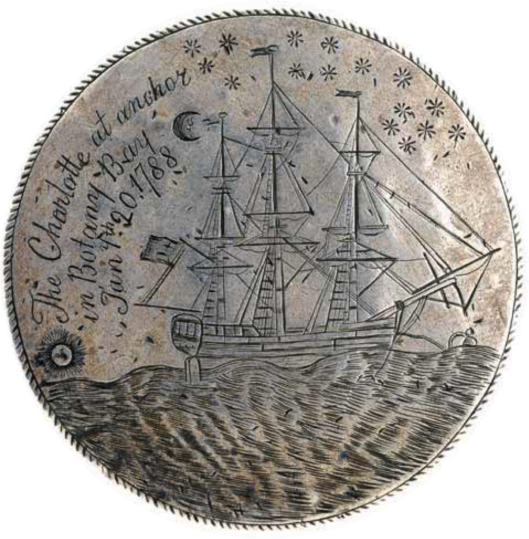 [12] After being a ringleader in the Mercury mutiny, Thomas Barrett was “in general tolerably well behaved but troublesome at times” on the hulk and went on to create Australia’s first colonial work of art, the Charlotte Medal, only to become the first man executed in Australia on 27 February 1788 for stealing beef and peas. William Blatherhorn was also a mutineer, having mutinied on both the Swift and the Mercury. He was, predictably, “troublesome” during his incarceration on the Dunkirk. Mary Broad, her future husband William Bryant, and other mutineers held on the Dunkirk such as James Martin and James Cox, became the first convicts to successfully escape the colony and return to England. Michaela Ann Cameron, “Charlotte,” Dictionary of Sydney, (2015) viewed 02 February 2016.