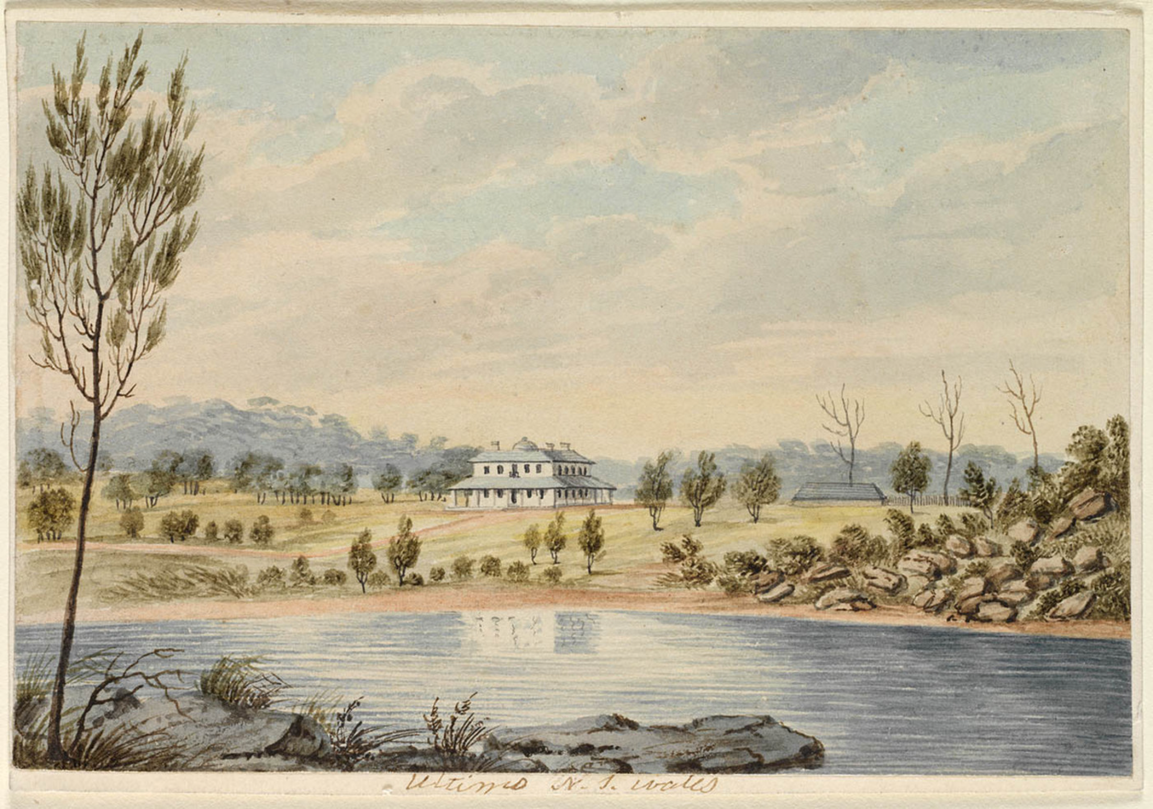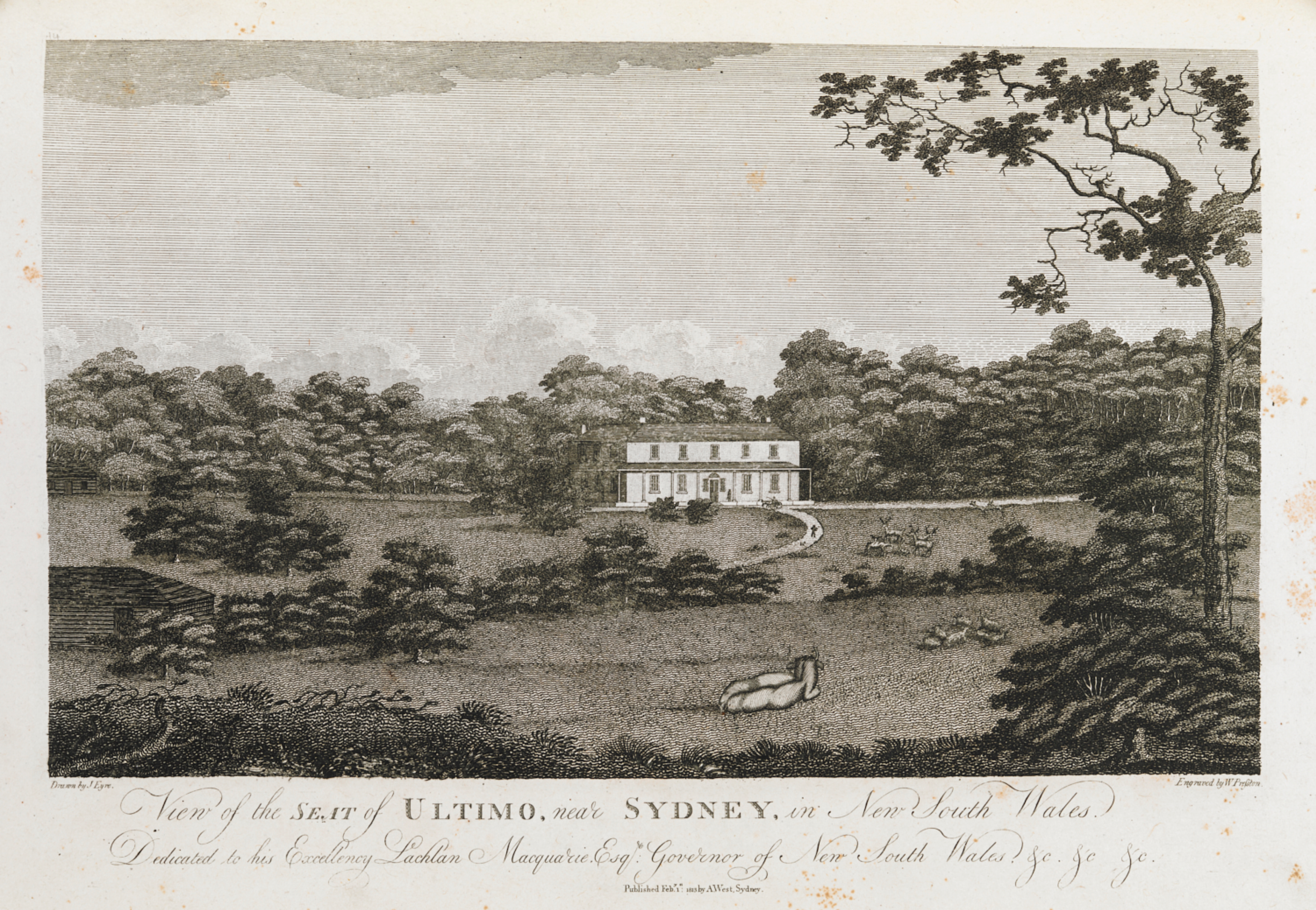 CLICK IMAGE TO ENLARGE. John Eyre, View of the SEAT of ULTIMO, near SYDNEY, in New South Wales.; Dedicated to his Excellency Lachlan Macquarie, Esq.r: Governor of New South Wales, &c. &c. &c., Engraved by W. Preston. (Sydney: 1 February 1813). CC BY 1.0. © British Library.