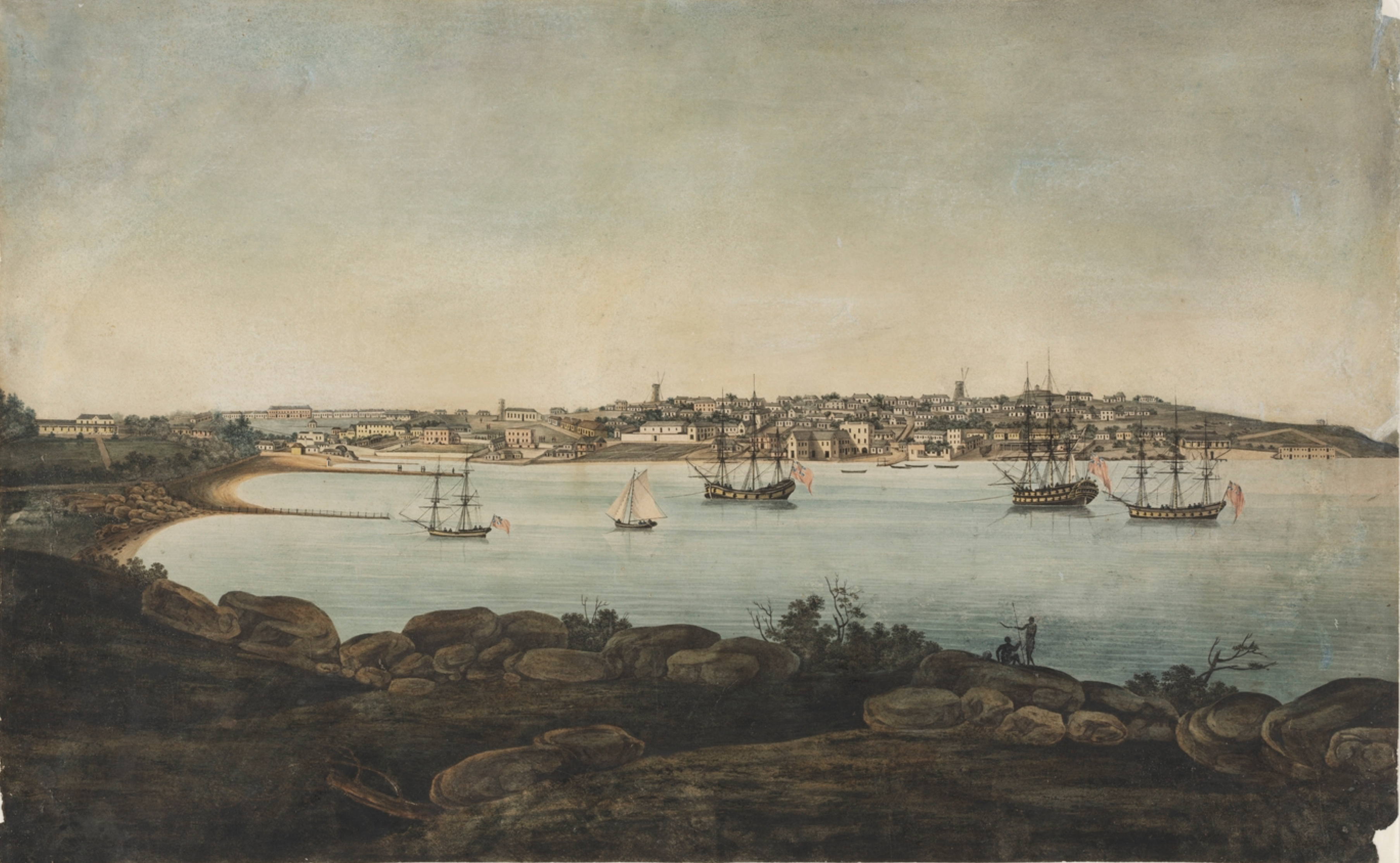 CLICK IMAGE TO ENLARGE. The Orphan School is the brown two-storey building immediately behind the first ship on the left. View of the west side of the Cove, c.1809, attributed to George W. Evans, V1 / ca. 1809 / 1 / FL3238797, State Library of New South Wales.