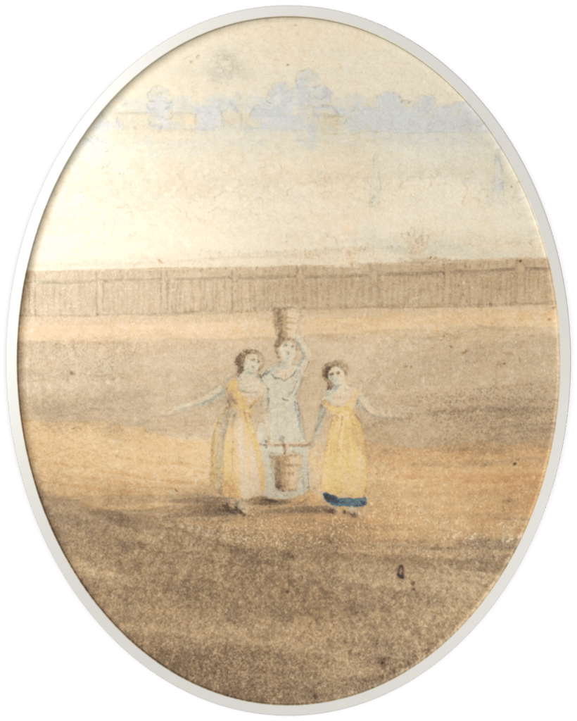 CLICK IMAGE TO ENLARGE. The Grimshaws lived in a hut with fellow convict Thomas Greensmith. In the first decades of European settlement, these huts lined the “High Street” of the town of Parramatta (later renamed George Street). The hut on the left is a good depiction of what those structures were like. View of Governor’s House, Rosehill, (c.1790), DG SSV1B / 3 / FL3310916, Dixson Galleries, State Library of New South Wales.
