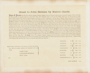 “Grant to John Batman by Native Chiefs … 1835,” in Sydney, Newcastle and Wollongong views with portraits and manuscript extracts, 1770–1886 (chiefly photographic copies of original works), DL PXX 71 / FL13383188, Dixson Library, State Library of New South Wales. https://digital.sl.nsw.gov.au/delivery/DeliveryManagerServlet?embedded=true&toolbar=false&dps_pid=FL13383188